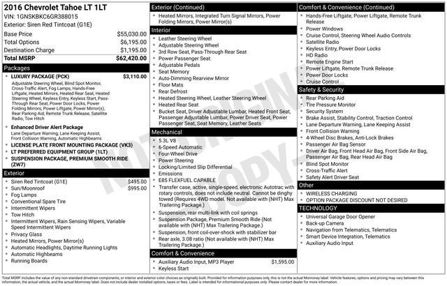 Clean CARFAX. Tahoe LT, 4D Sport Utility, EcoTec3 5.3L V8, 6-Speed Automatic Electronic with Overdrive, 4WD, Siren Red Tintcoat, Jet Black/Dark Ash Leather, 1st & 2nd Row Color-Keyed Carpeted Floor Mats, 2nd Row 60/40 Split-Folding Manual Bench, 2nd Row Pwr Release 60/40 Split Folding Bench Seat, 3rd Row 60/40 Power Fold Split-Bench, 3rd Row Manual 60/40 Split-Folding Fold Flat Bench, 4-Wheel Antilock Disc Brakes, 5 12-Volt Auxiliary Power Outlets, Auto-Dimming Inside Rear-View Mirror, Black Assist Steps, Bose Premium 9-Speaker System, Color-Keyed Carpeting Floor Covering, Driver Inboard & Front Passenger Airbags, Electronic Cruise Control w/Set & Resume Speed, Enhanced Driver Instrument Information Display, Extended-Range Remote Keyless Entry, Floor Console, Fog Lamps, Front & Rear Parking Assist, Hands Free Power Liftgate, Heated 2nd Row Seats, Heated Leather Wrapped Steering Wheel, Leather-Wrapped Steering Wheel, Luxury Package, Memory Settings, OnStar Basic Plan For 5 Years, Passive Entry System, Power Liftgate, Power Sunroof, Power Tilt & Telescopic Steering Column w/Memory, Power-Adjustable Accelerator & Brake Pedals, Power-Folding Heated Outside Mirrors, Preferred Equipment Group 1LT, Push Button Keyless Start, Rear Cross-Traffic Alert, Rear Park Assist w/Audible Warning, Roof-Mounted Luggage Rack Side Rails, Side Blind Zone Alert w/Lane Change Alert, SiriusXM Satellite Radio, Universal Home Remote, Wireless Charging, 18 x 8.5 Aluminum Wheels, 3.08 Rear Axle Ratio, 3rd row seats: split-bench, 4-Wheel Disc Brakes, 6-Way Power Front Passenger Seat Adjuster, 9 Speakers, ABS brakes, Adjustable pedals, Air Conditioning, Alloy wheels, AM/FM radio: SiriusXM, Apple CarPlay, Auto High-beam Headlights, Auto-dimming Rear-View mirror, Automatic temperature control, Brake assist, Bumpers: body-color, CD player, Compass, Delay-off headlights, Driver door bin, Driver vanity mirror, Dual front impact airbags, Dual front side impact airbags, Electronic Stability Control, Emergency communication system: OnStar, Exterior Parking Camera Rear, Forward Collision Alert Sensor Indicator, Front anti-roll bar, Front Bucket Seats, Front Center Armrest, Front dual zone A/C, Front Heated Reclining Bucket Seats, Front reading lights, Front wheel independent suspension, Fully automatic headlights, Garage door transmitter, Heated door mirrors, Heated front seats, Illuminated entry, IntelliBeam Headlamps, Lane Departure Warning System, Lane Keep Assist, Leather-Appointed Seat Trim, License Plate Front Mounting Package, Low tire pressure warning, Memory seat, Occupant sensing airbag, Outside temperature display, Overhead airbag, Overhead console, Panic alarm, Passenger door bin, Passenger vanity mirror, Pedal memory, Power door mirrors, Power driver seat, Power passenger seat, Power steering, Power windows, Premium audio system: Chevrolet MyLink, Premium Smooth Ride Suspension Package, Radio: Chevrolet MyLink AM/FM Stereo, Rain sensing wipers, Rear air conditioning, Rear anti-roll bar, Rear reading lights, Rear Seat Blu-Ray/DVD Entertainment System, Rear seat center armrest, Rear window defroster, Rear window wiper, Remote keyless entry, Roof rack: rails only, Safety Alert Driver Seat, Security system, Single-Slot CD/MP3 Player, Speed control, Speed-sensing steering, Split folding rear seat, Spoiler, Steering wheel mounted audio controls, Tachometer, Telescoping steering wheel, Tilt steering wheel, Traction control, Trip computer, Unauthorized Entry Electrical Theft Deterrent Sys., Variably intermittent wipers, Voltmeter, Tahoe LT, 4D Sport Utility, EcoTec3 5.3L V8, 6-Speed Automatic Electronic with Overdrive, 4WD, Siren Red Tintcoat, Jet Black/Dark Ash Leather, 1st & 2nd Row Color-Keyed Carpeted Floor Mats, 2nd Row 60/40 Split-Folding Manual Bench, 2nd Row Pwr Release 60/40 Split Folding Bench Seat, 3rd Row 60/40 Power Fold Split-Bench, 3rd Row Manual 60/40 Split-Folding Fold Flat Bench, 4-Wheel Antiloc