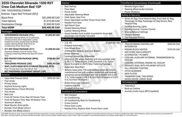 Clean CARFAX. Priced below KBB Fair Purchase Price! Silverado 1500 RST, 4D Crew Cab, EcoTec3 5.3L V8, 8-Speed Automatic, 4WD, Cajun Red Tintcoat, Jet Black w/Cloth Seat Trim, 12-Volt Rear Auxiliary Power Outlet, 2 USB Ports (First Row), 220 Amps Alternator, 4-Way Manual Driver Seat Adjuster, 4-Wheel Disc Brakes, 4.2 Diagonal Color Display Driver Info Center, 40/20/40 Front Split-Bench Seat, 4G LTE Wi-Fi Hot Spot Capable, 6 Speakers, 6-Speaker Audio System, ABS brakes, Air Conditioning, Alloy wheels, Apple CarPlay/Android Auto, Bluetooth® For Phone, Body Color Grille, Brake assist, Bumpers: body-color, Chevrolet Connected Access Capable, Chevytec Spray-On Black Bedliner, Cloth Seat Trim, Color-Keyed Carpeting Floor Covering, Compass, Deep-Tinted Glass, Delay-off headlights, Driver door bin, Driver vanity mirror, Dual front impact airbags, Dual front side impact airbags, Dual-Zone Automatic Climate Control, Electric Rear-Window Defogger, Electrical Lock Control Steering Column, Electronic Stability Control, Front anti-roll bar, Front Center Armrest w/Storage, Front fog lights, Front Frame-Mounted Black Recovery Hooks, Front LED Fog Lamps, Front reading lights, Front Rubberized Vinyl Floor Mats, Front wheel independent suspension, Fully automatic headlights, Heated door mirrors, Heated Steering Wheel, Heavy Duty Suspension, High Gloss Black Mirror Caps, Hill Descent Control, Illuminated entry, Integrated Trailer Brake Controller, Keyless Open & Start, LED Cargo Area Lighting, Low tire pressure warning, Manual Tilt-Wheel Steering Column, Manual Tilt/Telescoping Steering Column, Occupant sensing airbag, OnStar & Chevrolet Connected Services Capable, Outside temperature display, Overhead airbag, Overhead console, Panic alarm, Passenger door bin, Passenger vanity mirror, Power Door Locks, Power door mirrors, Power Front Windows w/Driver Express Up/Down, Power Front Windows w/Passenger Express Down, Power Rear Windows w/Express Down, Power steering, Power windows, Radio data system, Radio: Chevrolet Infotainment 3 System, Rear 60/40 Folding Bench Seat (Folds Up), Rear Dual USB Charging-Only Ports, Rear reading lights, Rear Rubberized-Vinyl Floor Mats, Rear step bumper, Rear Vision Camera, Rear window defroster, Remote keyless entry, Remote Vehicle Starter System, Security system, Single-Zone Manual/Semi-Automatic Air Conditioning, Speed control, Speed-sensing steering, Split folding rear seat, Steering Wheel Audio Controls, Steering wheel mounted audio controls, Steering Wheel Mounted Electronic Cruise Control, Tachometer, Theft Deterrent System (Unauthorized Entry), Tilt steering wheel, Traction control, Trip computer, Urethane Steering Wheel, Variably intermittent wipers, Voltmeter, Wheels: 18 x 8.5 Bright Silver Painted Aluminum, Silverado 1500 RST, 4D Crew Cab, EcoTec3 5.3L V8, 8-Speed Automatic, 4WD, Cajun Red Tintcoat, Jet Black w/Cloth Seat Trim.