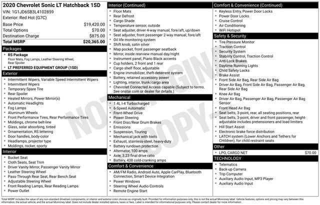 CARFAX One-Owner. Clean CARFAX. Sonic LT, 4D Hatchback, I4, 6-Speed Automatic, FWD, Red Hot, Jet Black Cloth, 3.23 Final Drive Axle Ratio, Electronic Cruise Control, Preferred Equipment Group 1SD, Premium 6-Speaker Audio System Feature, Satin Silver Shift Knob, 16 Aluminum Wheels, 2 USB Ports & Auxiliary Input Jack, 2-Way Manual Front Passenger Seat Adjuster, 4-Way Manual Driver Seat Adjuster, 6 Speakers, ABS brakes, Air Conditioning, Alloy wheels, AM/FM radio: SiriusXM, Apple CarPlay/Android Auto, Brake assist, Bumpers: body-color, Cargo Net, Delay-off headlights, Deluxe Cloth Seat Trim, Driver door bin, Driver vanity mirror, Dual front impact airbags, Dual front side impact airbags, Electronic Stability Control, Emergency communication system: OnStar and Chevrolet connected services capable, Exterior Parking Camera Rear, Front anti-roll bar, Front Bucket Seats, Front fog lights, Front reading lights, Front wheel independent suspension, Fully automatic headlights, Heated door mirrors, Illuminated entry, Knee airbag, Low tire pressure warning, Occupant sensing airbag, Outside temperature display, Overhead airbag, Panic alarm, Passenger door bin, Passenger vanity mirror, Power door mirrors, Power steering, Power windows, Radio data system, Radio: Chevrolet Infotainment 3 System w/AM/FM, Rear side impact airbag, Rear window defroster, Rear window wiper, Remote keyless entry, Security system, SiriusXM Radio, Speed control, Split folding rear seat, Spoiler, Sport steering wheel, Steering wheel mounted audio controls, Tachometer, Telescoping steering wheel, Tilt steering wheel, Traction control, Trip computer, Variably intermittent wipers, Sonic LT, 4D Hatchback, I4, 6-Speed Automatic, FWD, Red Hot, Jet Black Cloth, 3.23 Final Drive Axle Ratio, Electronic Cruise Control, Preferred Equipment Group 1SD, Premium 6-Speaker Audio System Feature, Satin Silver Shift Knob. 26/34 City/Highway MPG