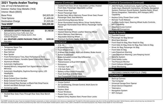 Avalon Touring, 4D Sedan, 3.5L V6 DOHC Dual VVT-i 24V, 8-Speed Automatic, FWD, Harbor Gray Metallic, Black w/SofTex Seat Trim, 14 Speakers, 4-Wheel Disc Brakes, 8-way Adjustable Heated/Ventilated Front Seats, ABS brakes, Adaptive suspension, Air Conditioning, Alloy wheels, AM/FM radio: SiriusXM, Apple CarPlay/Android Auto, Auto High-beam Headlights, Auto-dimming door mirrors, Auto-dimming Rear-View mirror, Automatic temperature control, Brake assist, Bumpers: body-color, Compass, Delay-off headlights, Driver door bin, Driver vanity mirror, Dual front impact airbags, Dual front side impact airbags, Electronic Stability Control, Emergency communication system: Safety Connect with 1-year trial, Exterior Parking Camera Rear, Four wheel independent suspension, Front anti-roll bar, Front Bucket Seats, Front Center Armrest, Front dual zone A/C, Front reading lights, Fully automatic headlights, Garage door transmitter: HomeLink, Heads-Up Display, Heated door mirrors, Heated front seats, Heated rear seats, Heated steering wheel, Illuminated entry, Knee airbag, Low tire pressure warning, Memory seat, Navigation system: Dynamic Navigation (3-year trial), Occupant sensing airbag, Outside temperature display, Overhead airbag, Overhead console, Panic alarm, Passenger door bin, Passenger vanity mirror, Perforated SofTex Seat Trim w/Ultrasuede, Power door mirrors, Power driver seat, Power moonroof, Power passenger seat, Power steering, Power windows, Radio data system, Radio: Premium Audio w/Dynamic Navigation, Rear anti-roll bar, Rear reading lights, Rear seat center armrest, Rear side impact airbag, Rear window defroster, Remote keyless entry, Security system, Speed control, Speed-sensing steering, Split folding rear seat, Spoiler, Steering wheel memory, Steering wheel mounted audio controls, Tachometer, Telescoping steering wheel, Tilt steering wheel, Traction control, Trip computer, Turn signal indicator mirrors, Variably intermittent wipers, Ventilated front seats, Wheels: 19 x 8.0 Black Machined Finish Alloy, Avalon Touring, 4D Sedan, 3.5L V6 DOHC Dual VVT-i 24V, 8-Speed Automatic, FWD, Harbor Gray Metallic, Black w/SofTex Seat Trim. 22/31 City/Highway MPG